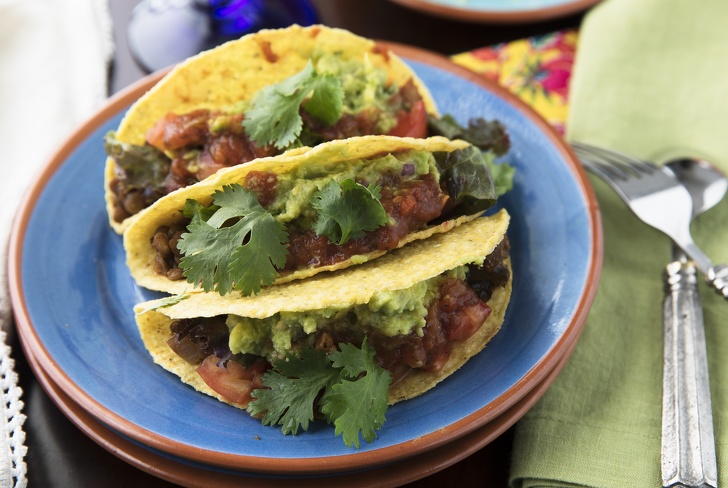 3. Розігріти тортильї відповідно до інструкції, наповнити начинкою, полити сальсою. Прикрасити капустою, авокадо і лаймом.