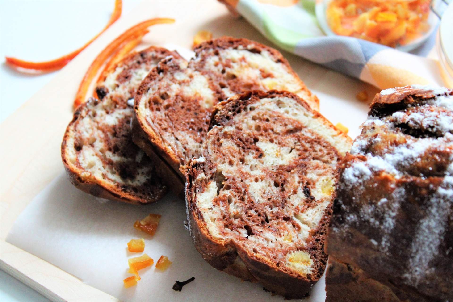 В одну частину тіста додаємо какао та шматочки темного шоколаду, а в другу частину столову ложку борошна та апельсинові цукати обо різнокольорові магазинні цукати. Саме шоколад та цукати роблять цей кекс незвичайним та дуже святковим.