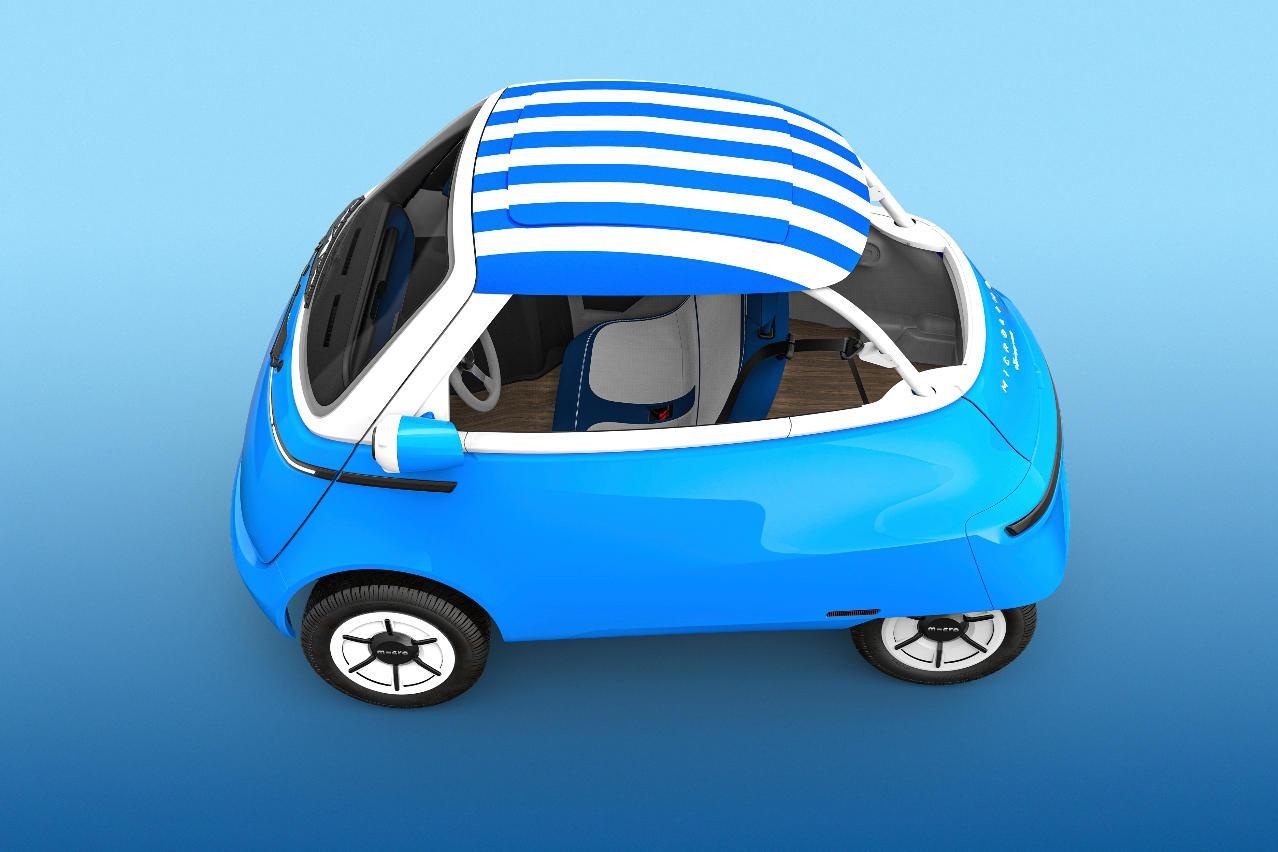 Головні відмінності Spiaggina від стандартного Microlino – м’який дах-тент та відсутність бокових і заднього вікон. Також встановлено дуги безпеки.