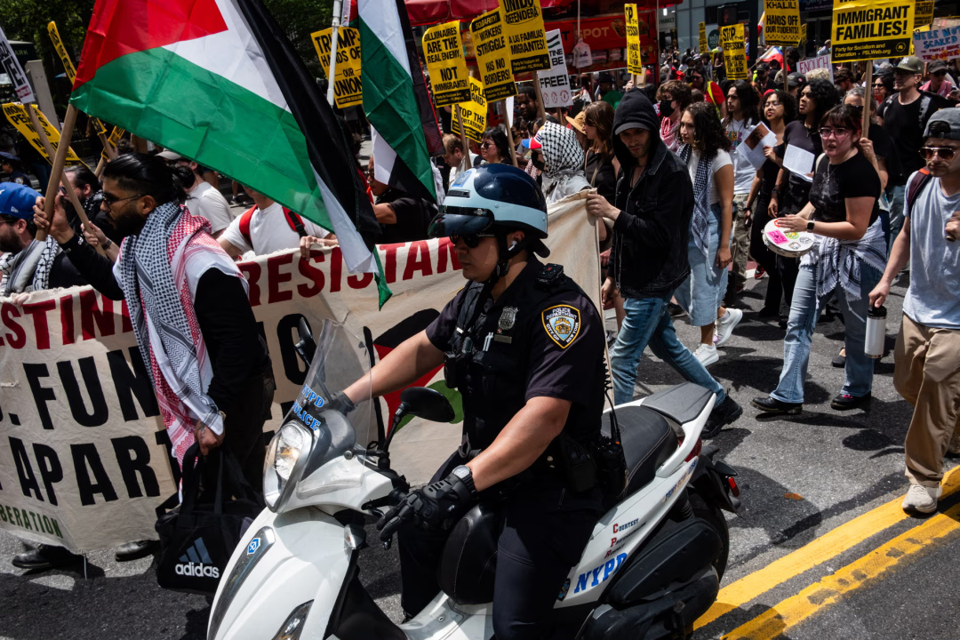 У Нью-Йорку протестувальники виступили на підтримку робітників, іммігрантів та всіх, хто зазнав утисків з боку адміністрації Трампа. Учасники мітингу протестували також проти атак влади на Колумбійський університет.