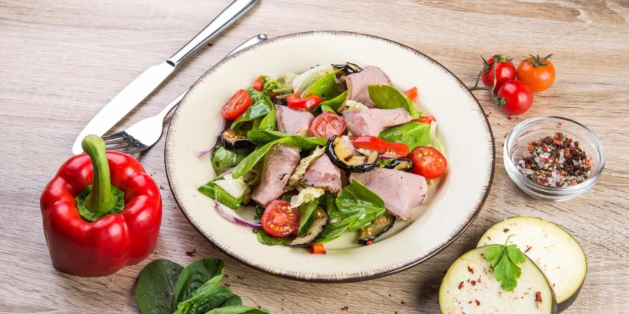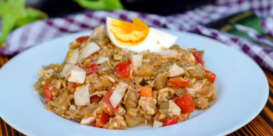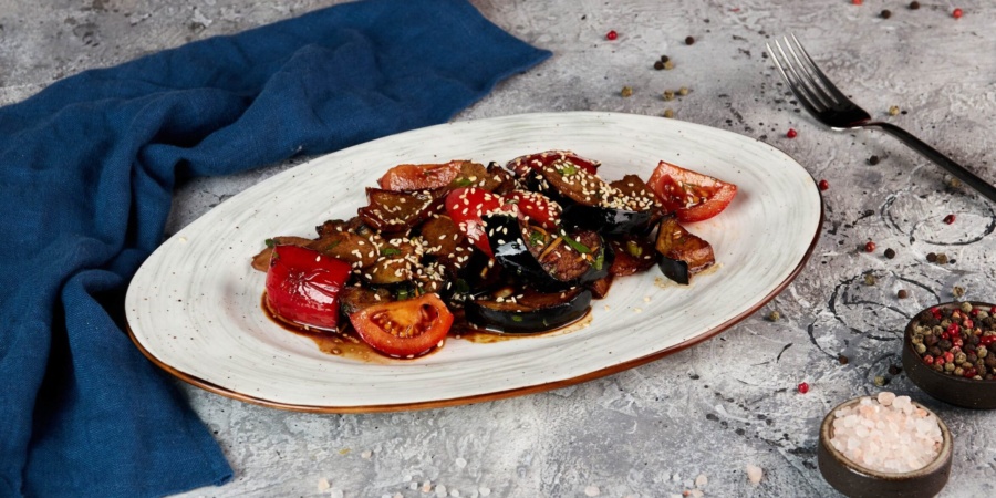 Салат з баклажанами, куркою, перцем і кунжутною заправкою