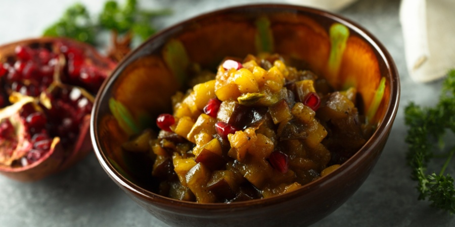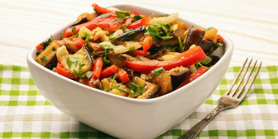 Салат з баклажанами, болгарським перцем, гранатом і гостро-солодкою заправкою