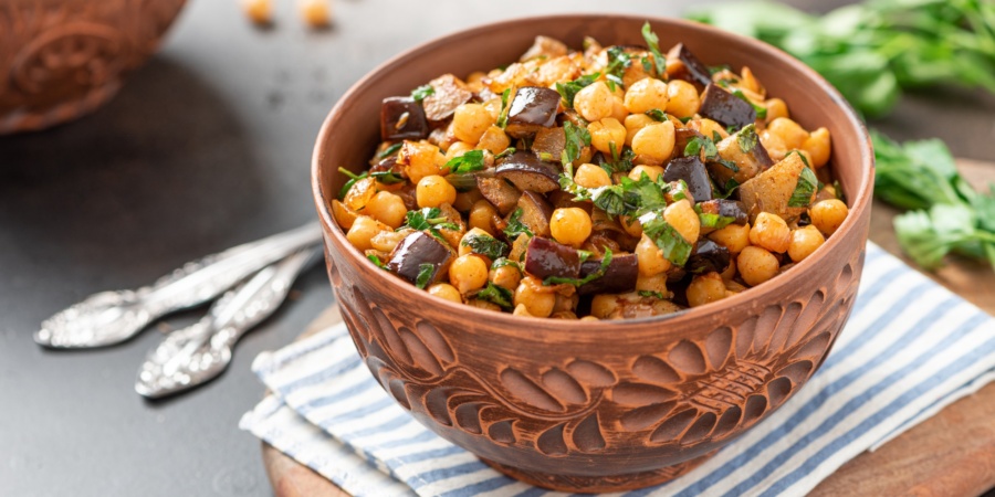 Поріжте баклажани на дрібніші шматочки, додайте нут, подрібнену кінзу і дрібно нарізану цибулю.