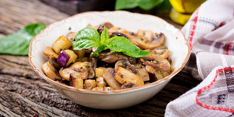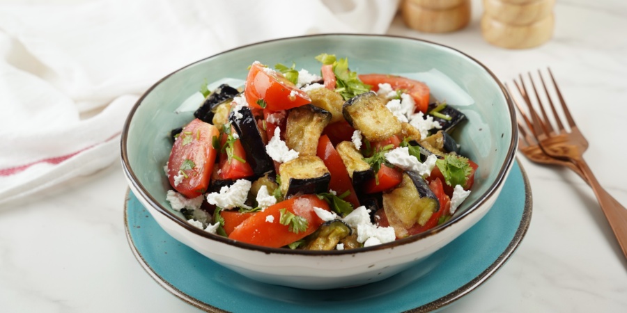 Промийте баклажани і обсмажте на сковороді з розігрітою олією 10–15 хвилин, помішуючи. Викладіть баклажани та свіжі овочі в салатницю.