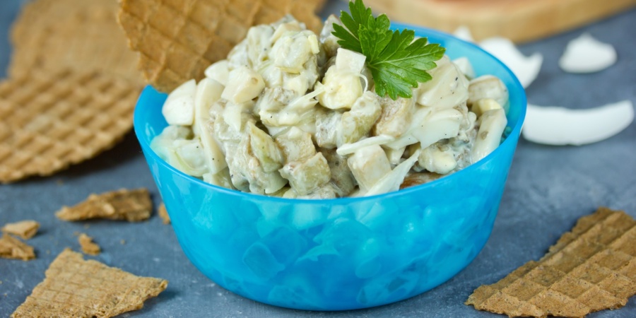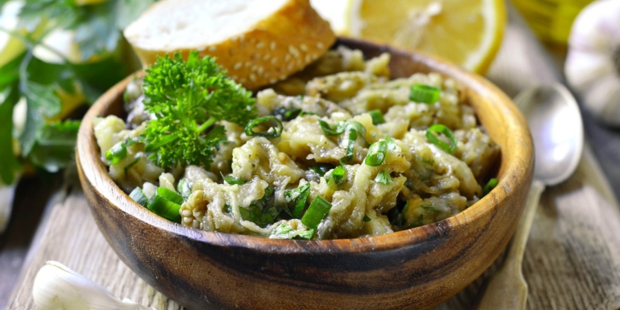 Салат із смаженими баклажанами, цибулею та гірчичною заправкою