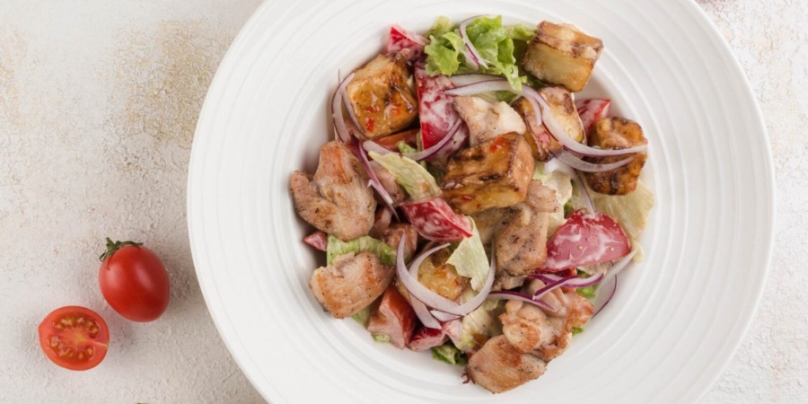 Теплий салат з баклажанами, смаженою куркою і соусом чілі