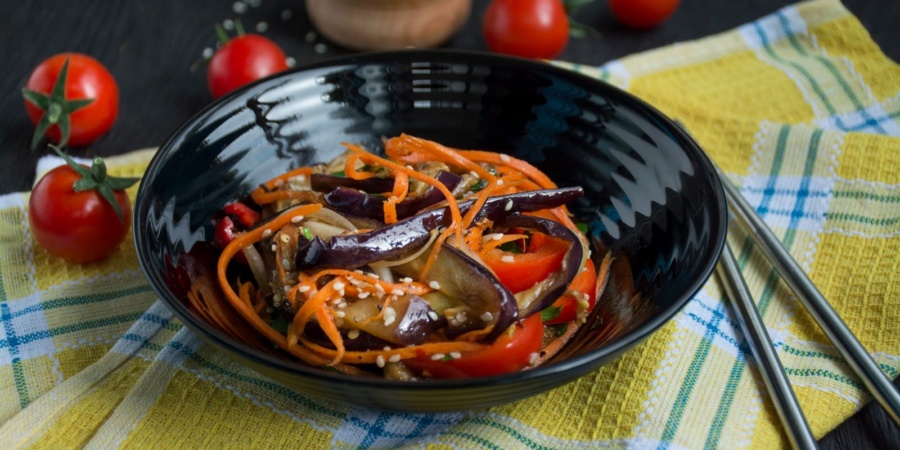Наріжте баклажани тонкою довгою соломкою, посоліть і залиште на півгодини. Наріжте перці тонкою соломкою, цибулю — півкільцями. Натріть моркву на тертці для корейської моркви. Подрібніть часник.