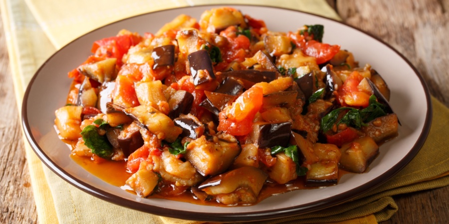 Зробіть проколи на баклажані та запечіть у духовці при 200 °C 45–55 хвилин до м’якості. Очистіть, трохи відтисніть сік і наріжте кубиками.