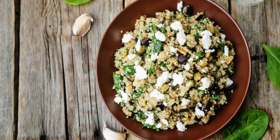 Відваріть кіноа у воді. Наріжте баклажани невеликими шматочками, змішайте з 2 ложками олії, сіллю і перцем. Запікайте овочі 20–25 хвилин при температурі 220 °С, під час приготування перемішайте.