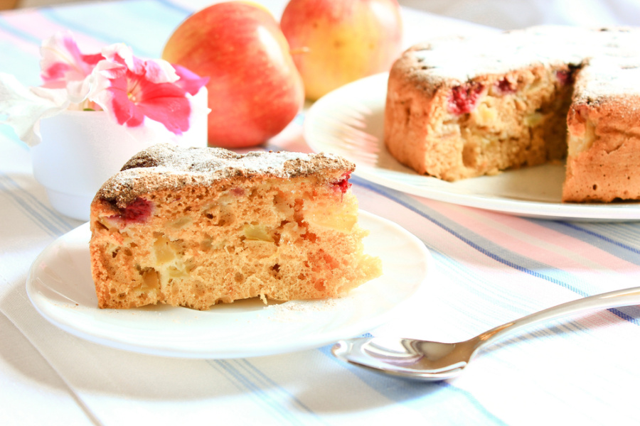 - Форму змастіть олією, всипте ревінь і яблука, розподіліть по формі. Залийте тістом і випікайте при 180°C пів години. Готовність тіста перевіряйте дерев’яною шпажкою: вона має бути сухою після входження в тісто.