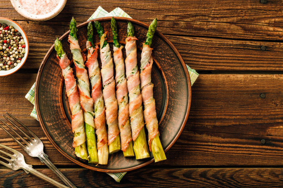 - Кожне стебло туго обкрутіть смужкою бекону по колу.