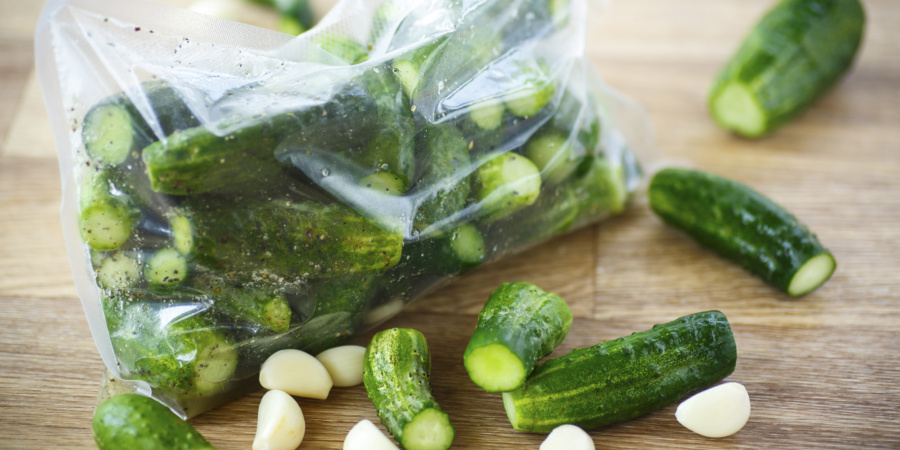 Цей рецепт не потребує розсолу: огірки настоюються у власному соку й зберігають чудову хрумкість. Пакет зручно зберігати в холодильнику, навіть у висувному ящику.