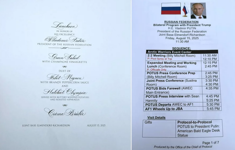 На першій сторінці був розклад зустрічей на 15 серпня із зазначенням конкретних кімнат на базі в Анкориджі. Також у документах ішлося про намір Трампа передати Путіну урочистий подарунок.