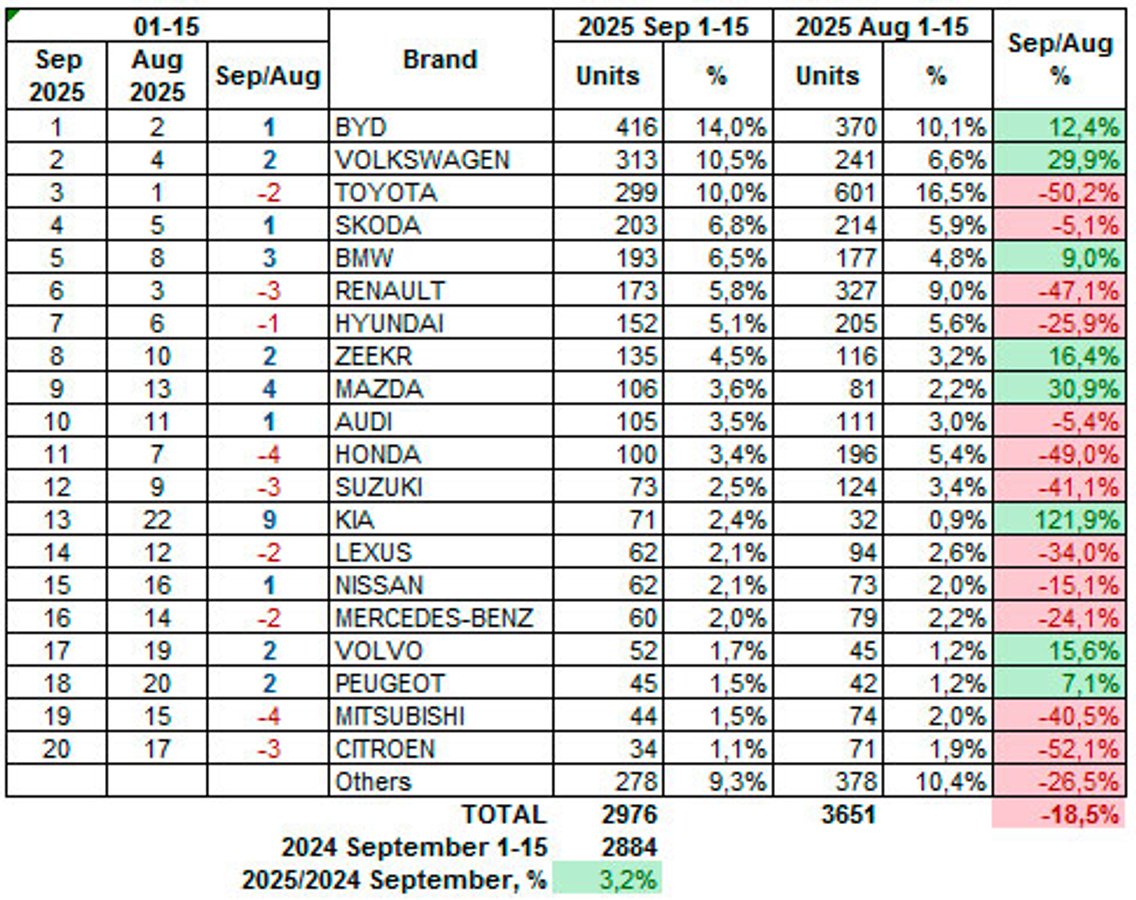 Показники продажів всіх операторів за 15 днів вересня і вперше зафіксували на 1-му місці китайський бренд BYD. Йому вже вдалося зайняти 14% українського ринку і потіснити лідера останніх років — Toyota.
