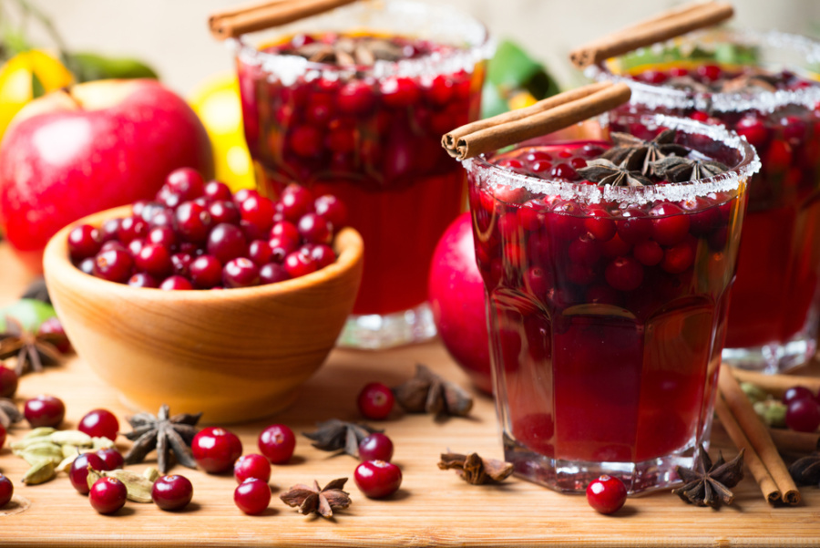 Гарячим пуншем можна почастувати гостей або зварити чашечку ввечері, аби зігрітися. З журавлини треба зробити сік, а частину ягід лишити. Змішати з соком апельсина та яблучним (пропорція трьох видів соку 1:1:4, найбільше апельсинового). Сік налити в каструлю, додати ягоди журавлини, м’яту, корицю, мускатний горіх. Проваріть хвилин 10, не доводячи до кипіння та смакуйте.