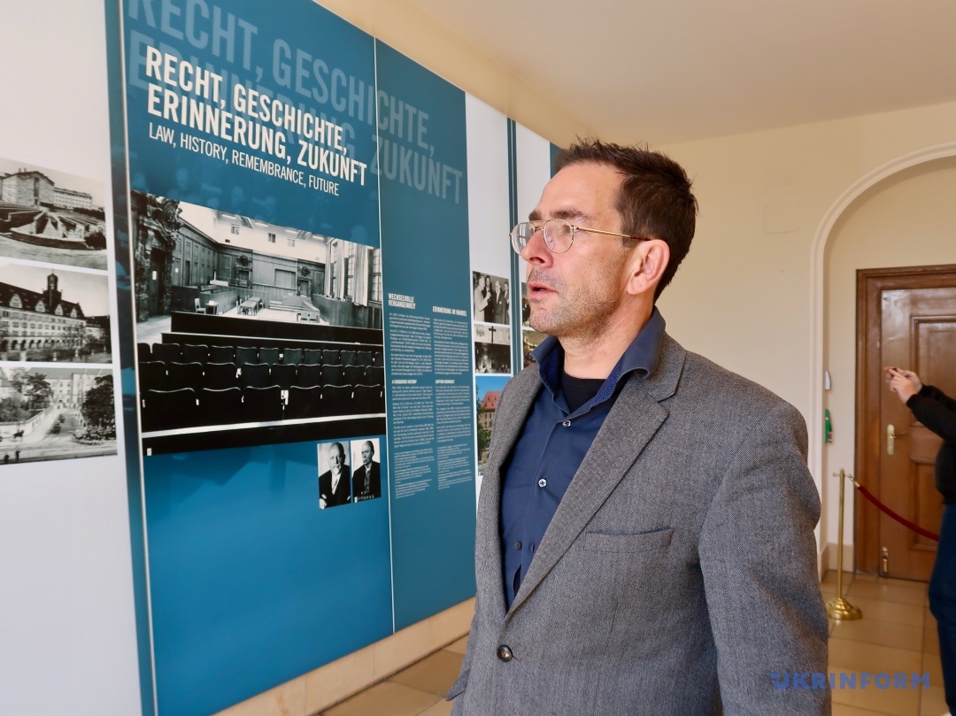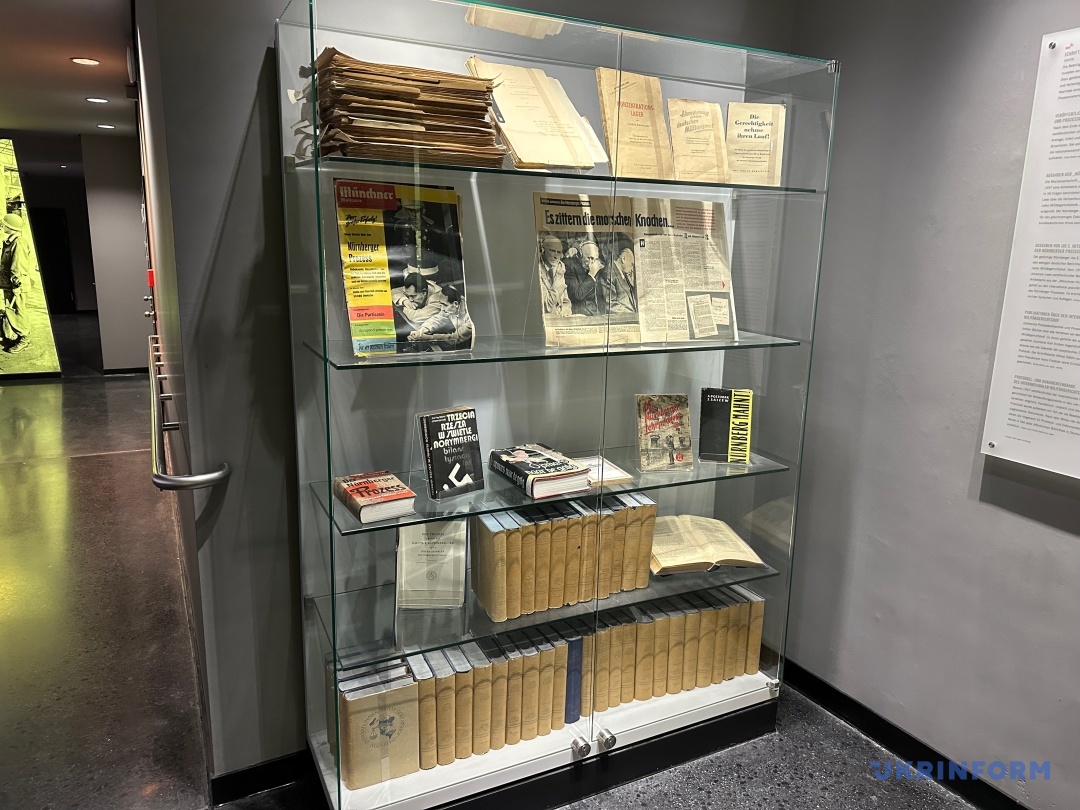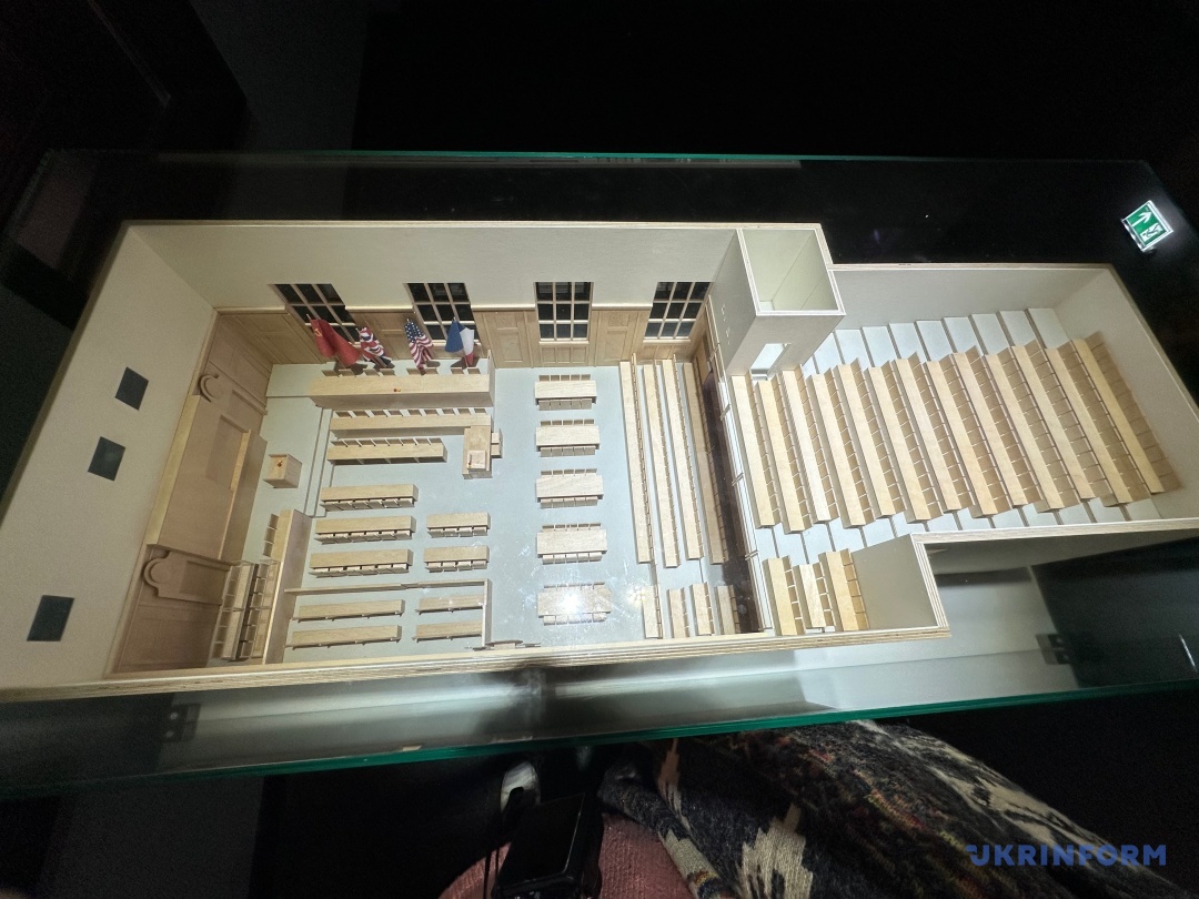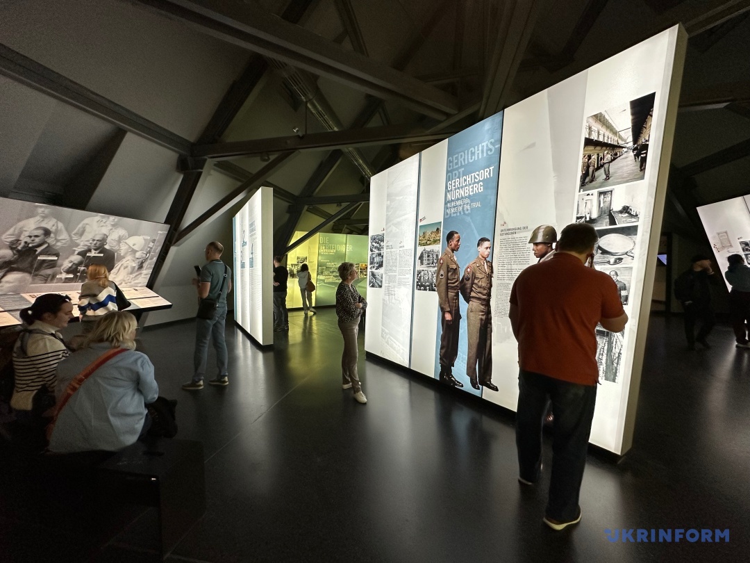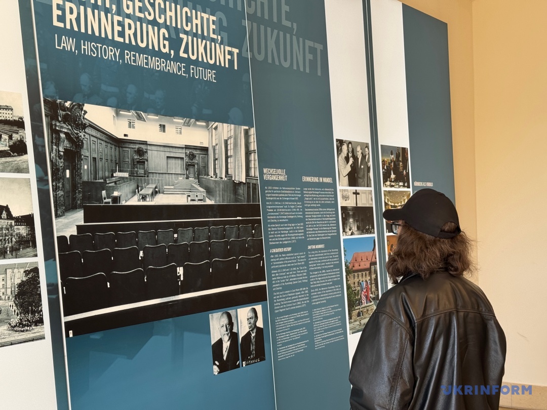 Експозиція музею, не дуже велика, та 20-хвилинне відео, яке показують у знаменитій Залі суду №600, де власне й проходили засідання, – це архівні матеріали, які стосуються не лише того трибуналу, а й наступних процесів після Другої світової. Але не тільки: тут представлена інформація і про вплив Нюрнберзького трибуналу до сьогодні, зокрема, про відносно недавні суди над тими, хто скоїли злочини проти людяності по всьому світу. Важливо, що у відео вже є згадка про російську війну в Україні. «Кожна атака, кожне бомбардування є злочином агресії. Володимир Путін має бути притягнутий до відповідальності за звірства, скоєні російськими військами в Україні. Така поведінка потребує воєнного трибуналу на кшталт Нюрнберзького», – лунає у судовій залі. Поки що з велетенського екрана. Хочеться сподіватися, що одного дня в музеї з’явиться ще один повноцінний стенд.