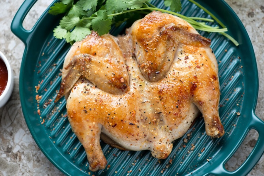 Цей рецепт підходить для аерогрилів із місткою чашею об’ємом від 6–7 літрів. Якщо у вас прилад меншого розміру, розріжте птицю на шматки і готуйте порційно.