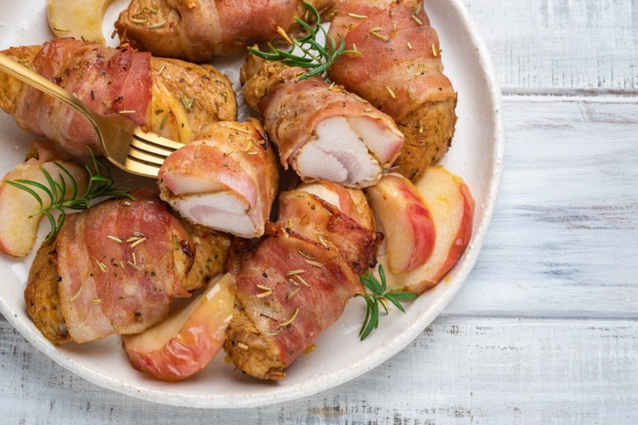 - Складіть разом брусок індички і часточку яблука. Обгорніть беконом, за потреби закріпивши зубочистками.