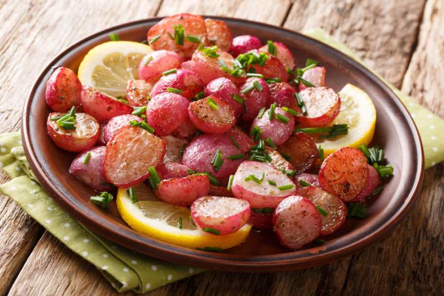Редиску можна не тільки нарізати до салатів, а й запікати, додавати в рагу та до закусок. Цей овоч малокалорійний, містить вітаміни А, С і В. Гарнір з редиски — найкращий варіант, коли купили дуже пекучі овочі, обсмаження зробить смак м’якшим.