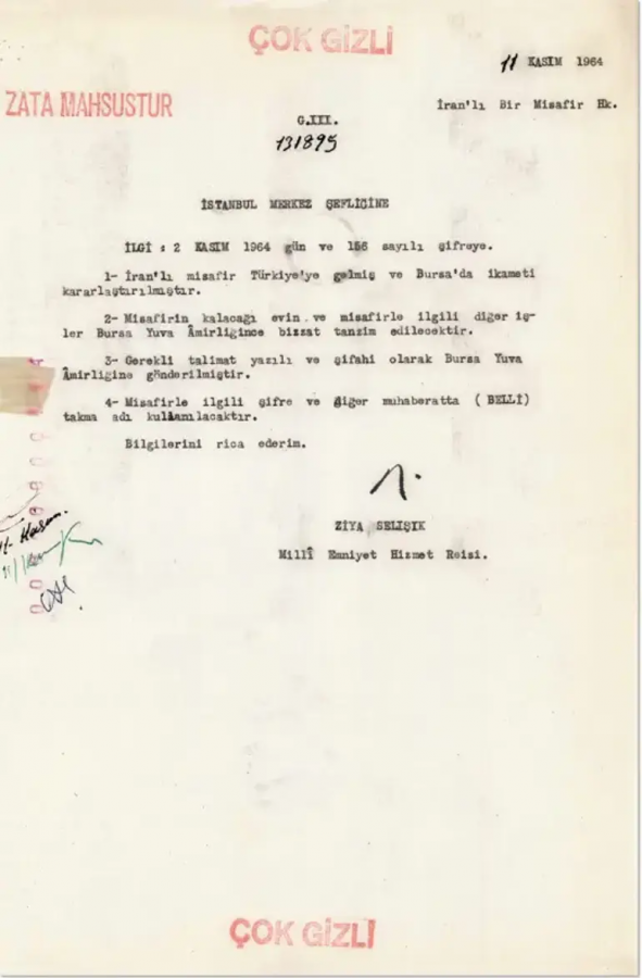«Документ містить наказ від 11 листопада 1964 року з позначкою «цілком таємно», надісланий до Стамбульського центрального управління за підписом керівника Служби національної безпеки Зії Селішика, у межах перебування лідера іранської революції аятоли Хомейні в Туреччині під наглядом MİT у період з 4 листопада 1964 року до 5 жовтня 1965 року», – повідомляє телеканал.